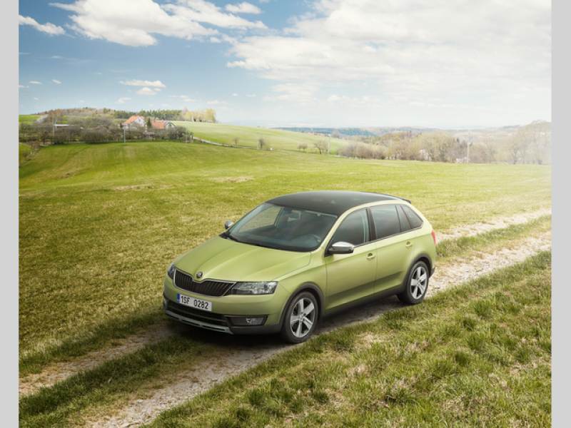 Škoda Rapid Spaceback Scoutline, předlouhý název, který rapidu přidává zvýrazněné přední a zadní nárazníky, místo odstínu laku karoserie je na nich použita černá matná, a uprostřed jsou zvýrazněné reflexní stříbrnou. Stejný odstín mají také vnější zpětná zrcátka. Tmavé plasty chrání také prahy a lemy blatníků, a s paketem se pojí také šestnáctipalcová kola z lehkých slitin v designu ‚Rock’, nebo sedmnáctipalcová kola v designu ‚Camelot‘. Jestliže Octavia Scout má pohon všech kol, tak u rapidu byste jej hledali marně – zůstává pouze předokolkou.