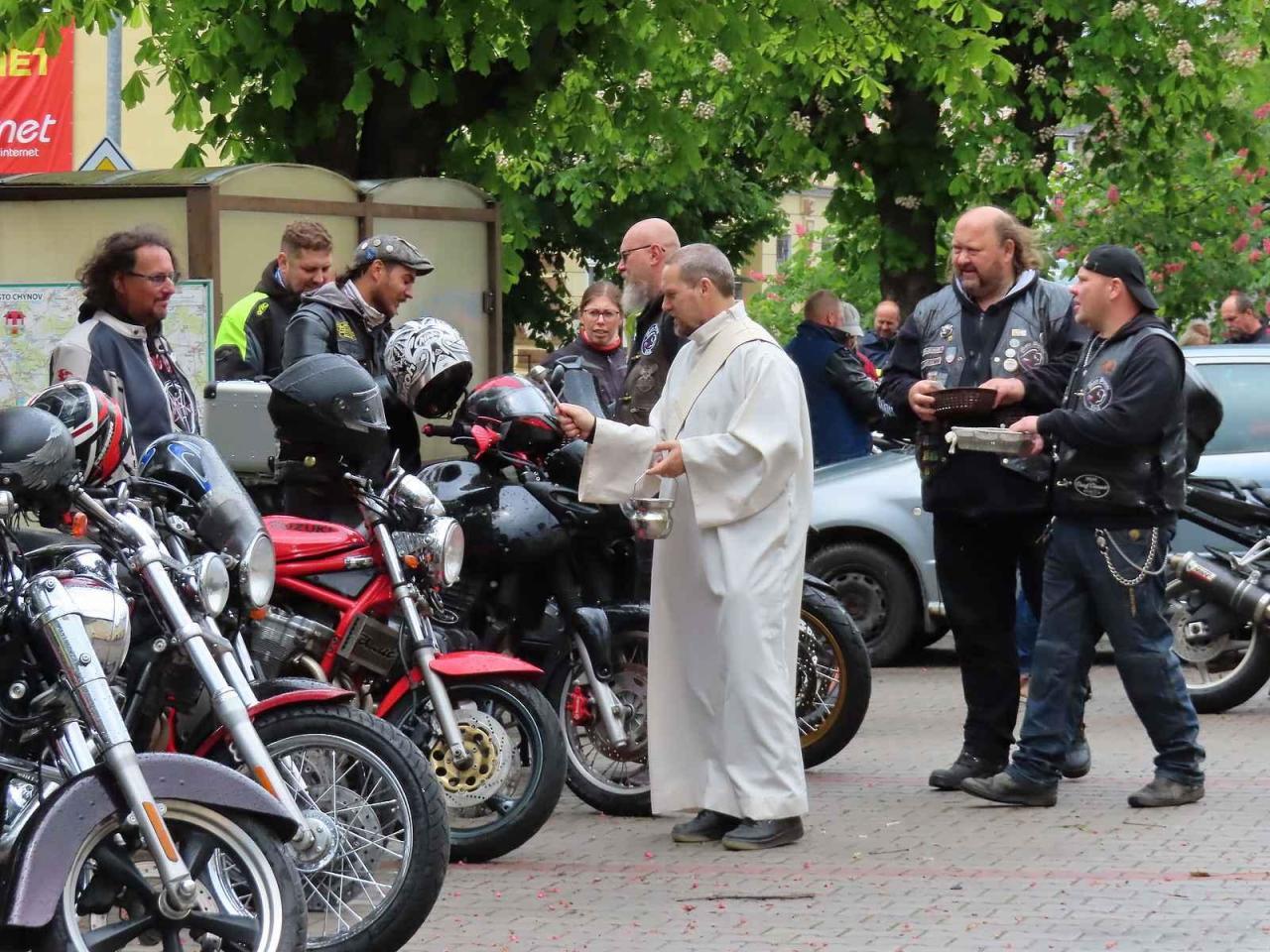 Kostel Nejsvětější trojice v Chýnově na Táborsku praskal v sobotu 18. května ve švech. Jeho lavice zaplnili motorkáři a motorkářkky z širokého okolí. Klub Moto Bizoni Czech totiž pořádal tradiční sraz spojený s požehnáním motorek. Rychlým strojům tak požehnal jáhen Václav Mikula. Ten zaparkované stroje na Gabrielově náměstí kropil svěcenou vodou a jejich řidičům popřál hlavně jízdu bez nehod a šťastné návraty domů.