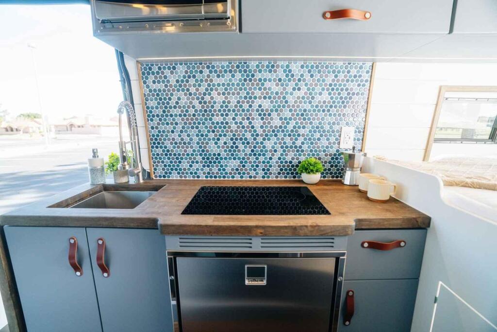 Naproti – na straně spolujezdce – je menší kuchyňka s potřebným vybavením k vaření. Má hluboký nerezový dřez, lednici s malým mrazákem a pracovní dřevěnou desku s výklopným prodloužením. Jídlo lze vařit na indukční varné desce se dvěma plotýnkami. Řešením může být i mikrovlnná trouba. Také je zde umístěný ventilátor odvádějící pachy a výpary z vaření. Skříňky a zásuvky jsou rovněž součástí.