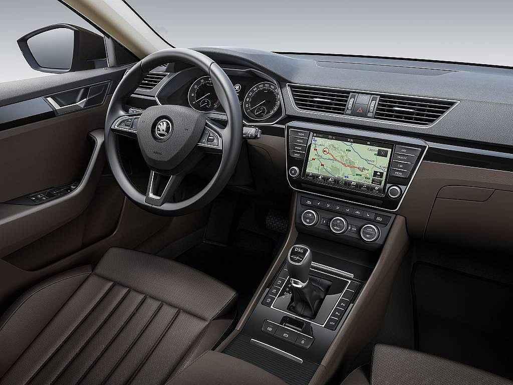 Zveřejněná fotografie ukazuje palubní desku se strohými a čistými liniemi - tak typickými pro Škodu. Dokazuje také, že nová vlajková loď dostane elektronickou ruční brzdu a možnost volit mezi několika jízdními režimy.