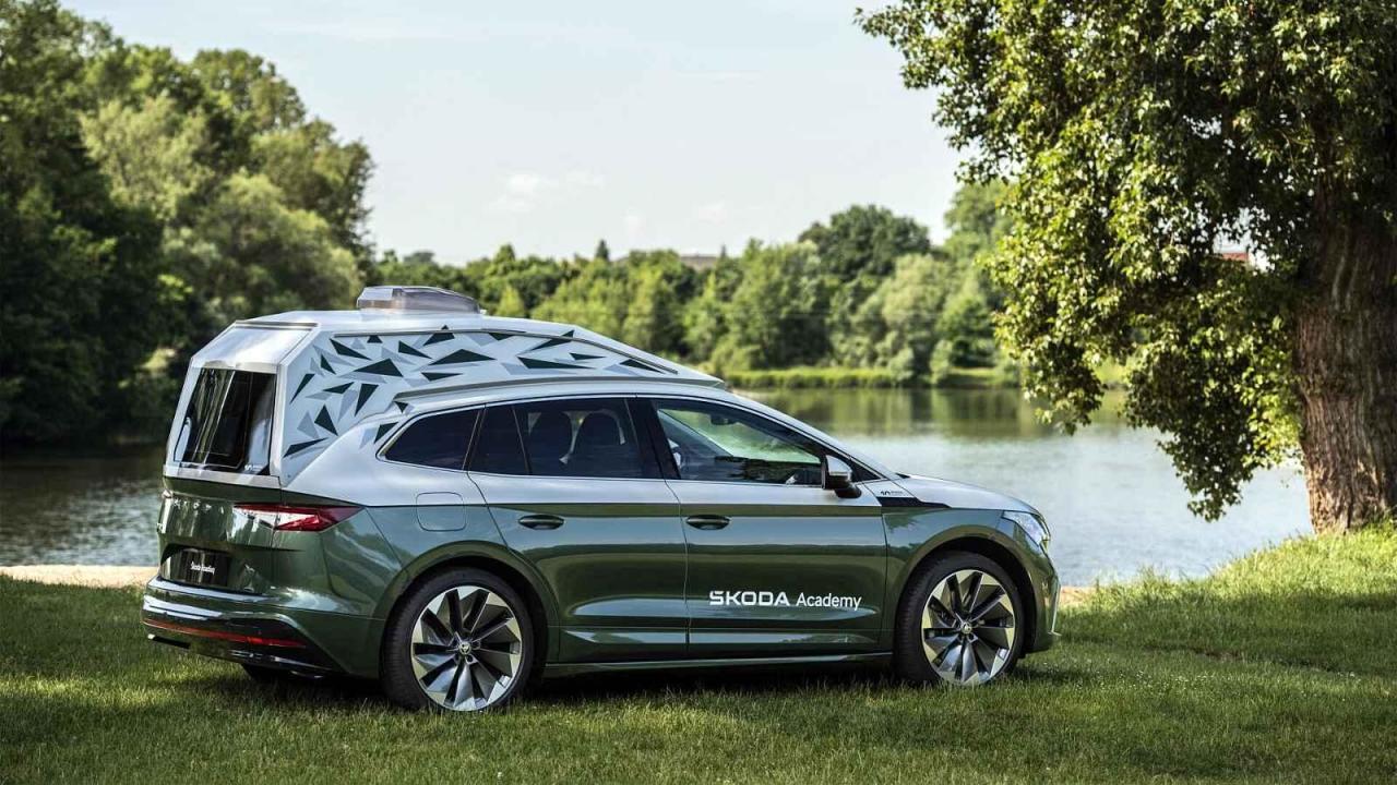 přestavěný Enyaq nazýván, dostal prodloužený rozvor, a hlavně vyvýšenou „budku“, která se jako šnečí ulita táhne přes střechu až po páté dveře. Ta je zde za účelem zvýšení vnitřního prostoru, v jehož zadních partiích se nachází spaní spolu s úložnými prostorami. Zde je vše vyrobeno na míru s ohledem na udržitelnost a ekologičnost materiálů.
