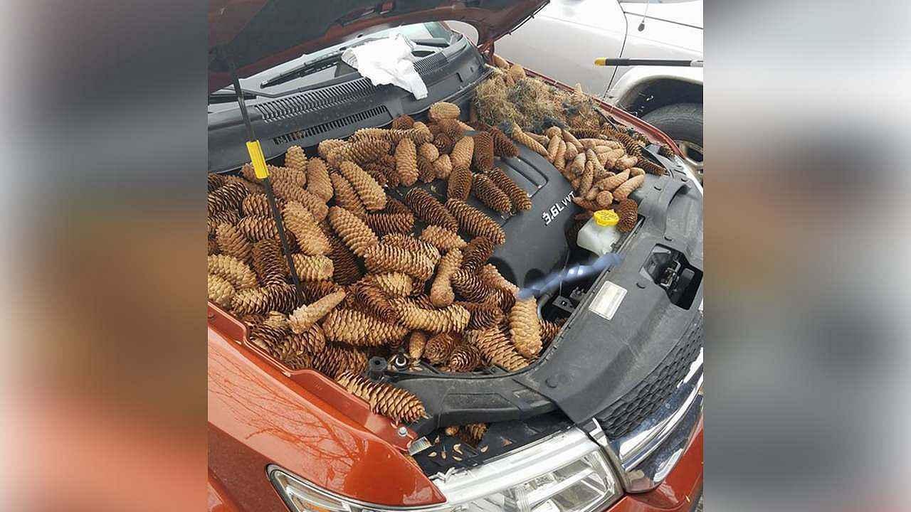 Malá divoká zvířátka během chladných jarních nocí často považují vyhřátý motorový prostor vašeho vozu jako skvělé útočiště, a v případě veverky z Michiganu, i jako skvělou spižírnu, kam si pro horší časy uskladnit nějakou tu šišku.