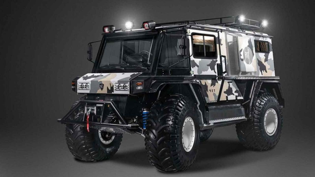 Za tu cenu dostanete drsně vypadající stroj, který zastíní běžná auta svojí velikostí. Vůz je široký skoro 2,5 metru a dlouhý 4,9 metru. Hlavní je ale jeho světlá výška – podvozek se pohybuje v neuvěřitelných 60 centimetrech nad zemí, tedy třikrát výš než u běžných SUV. Tohle auto se brodu rozhodně nelekne!