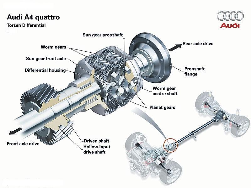 Audi už 25 let používá systém jménem quattro, jehož hlavní součástí je mezinápravový diferenciál typu Torsen. Pohon všech kol je stálý, od roku 1995 je namísto uzávěrky diferenciálu používán elektronický systém EDS, který mění distribuci točivého momentu na jednotlivé nápravy podle potřeby.