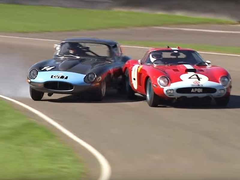 Nejprve Ferrari jen o pověstný chlup uniklo střetu s Jaguarem E-Type, přičemž ani jeden z aktérů zřejmě dosud netuší, jak se srážce vyhnuli, podruhé už však řidič rudého závoďáku (který v obou případech zvolil hodně zvláštní stopu) takové štěstí neměl.