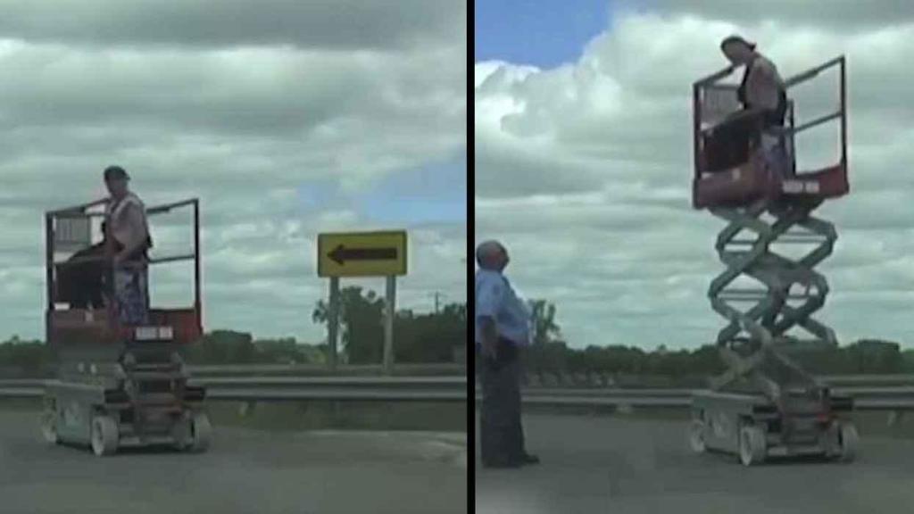 Video začíná docela klasickým zastavením. A následuje dotaz ze strany policisty: „Co to tady k sakru děláte?“. Chlapík na plošině, který je mimochodem zcela patrně přiopilý, se začne vymlouvat, že pracuje na stavbě nedaleko a že si jen zajel pro oběd a pár sodovek do obchodu.