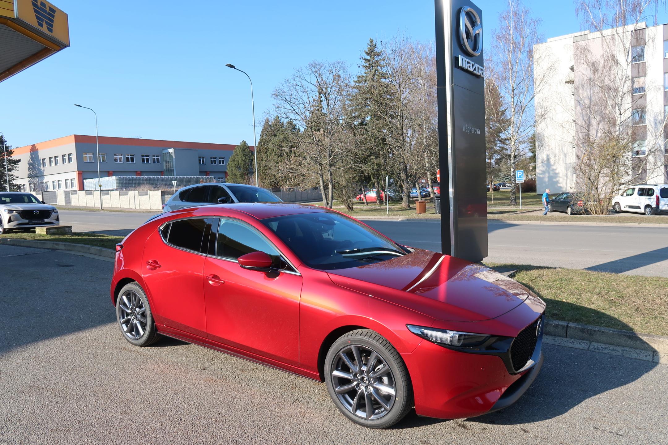 Staršímu MPS byla zhusta vytýkána až příliš velká uniformita ve srovnání obyčejným provedením a proto se u aktuálního provedení designéři jali situaci patřičně vylepšit. Pětidveřová karoserie (je velká škoda, že u Mazdy nevymysleli nějakou třídveřovou kreaci) sice samozřejmě stále nezaměnitelně prozrazuje svůj mainstreamový původ, rozmanité „okřídlení“ jí ale dodává patřičného sportovního ducha. Patrné je to hned zepředu, kde se na vás agresivně zubí mocný sací otvor na kapotě, který nápadně připomíná Imprezu. Z boku zaujmou vystouplé blatníky halící nízkoprofilové „osmnáctky“, zezadu pak rozměrné křídlo, které na svém místě nad zadním oknem evidentně není jen tak pro okrasu. Nejsilnější provedení poznáte také podle dvou nápadných koncovek výfuku po stranách zadního nárazníku. Ten správný říz dodávala všemu v našem případě temperamnetní rudá metalíza.